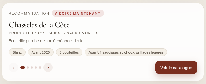 Les bouteilles proches de leur échéance remontent automatiquement dans le dashboard. Une recommandation personnalisée vous aide à ne jamais rater une fenêtre de dégustation optimale.