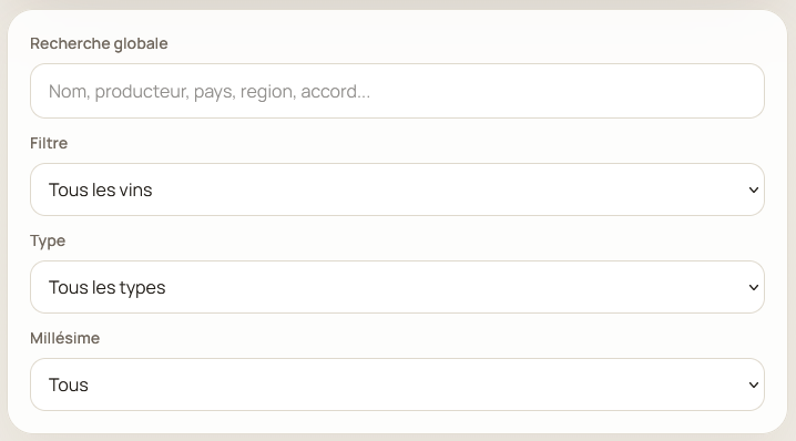 Recherche transversale, filtres par type et millésime, tri personnalisable, vue casier par emplacement — votre stock toujours à portée de main, en quelques secondes.