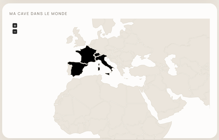 Valeur totale du stock, carte mondiale des origines, répartition par type de vin : une vision claire et synthétique de ce que vous possédez vraiment.